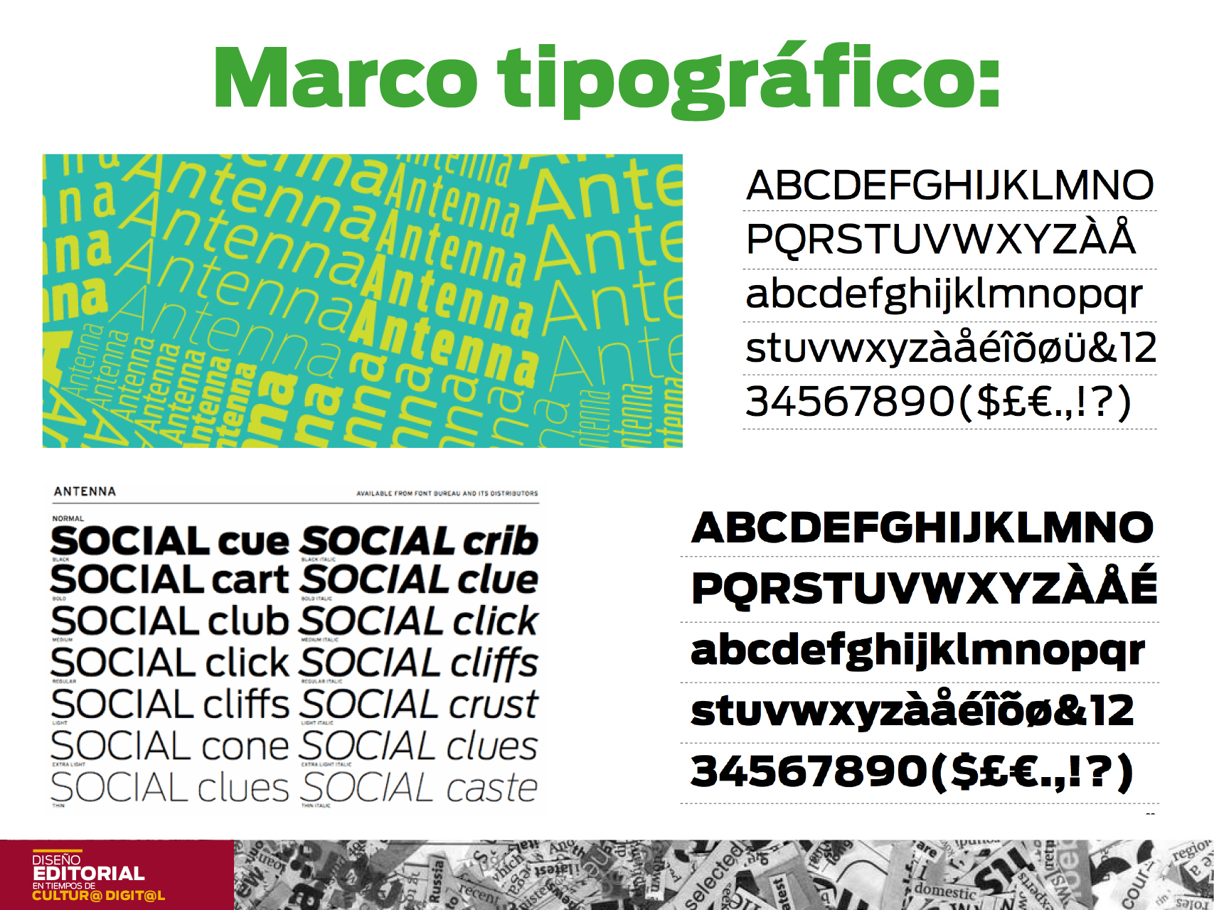 La tipografía que se adquirió para en el diseño del inserto fueron la Avenir, Compatil y Antena, de la casa Linotype, mismas que le darían identidad propia al proyecto.